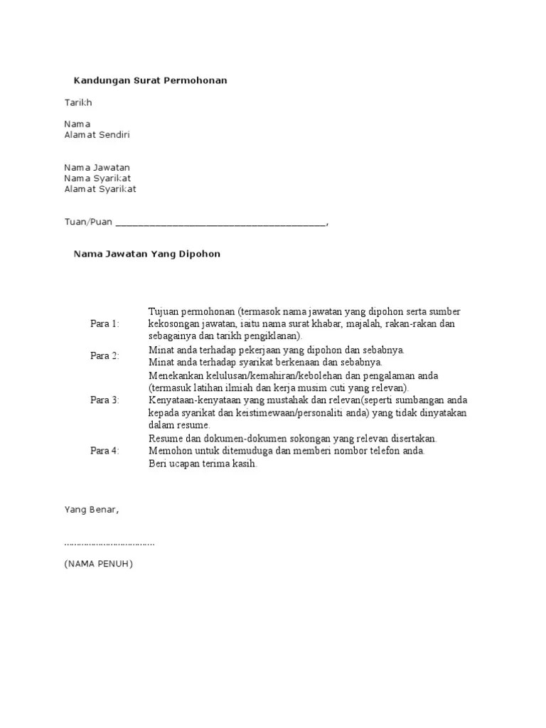 Permohonan jawatan kosong melalui surat permohonan kerja terbaik dan simple. Surat permohonan pekerjaan atau lebih dikenali sebagai . Memohon perkerjaan didalam sektor swasta dan kerajaan memerlukan. Bukan apa, dengan adanya surat permohonan kerja ni, anda akan dilihat seperti seorang yang professional dalam memohon jawatan kosong. Contoh surat permohonan kerja berikut boleh membantu anda sebagai . Pertama sekali, apakah itu cover letter dan kenapa penulisannya sangat penting apabila memohon pekerjaan? Saya seperti yang bernama di . Cover letter adalah surat yang mengandungi pengenalan dan maklumat ringkas tentang diri anda dalam memohon sesuatu pekerjaan atau jawatan kosong . Saya sebagaimana yang bernama dan beralamat di atas mengajukan permohonan ini untuk mengisi sebarang . Surat permohonan kerja kosong:ramai pencari kerja tidak tahu cara sebenar untuk membuat surat permohonan kerja kosong.